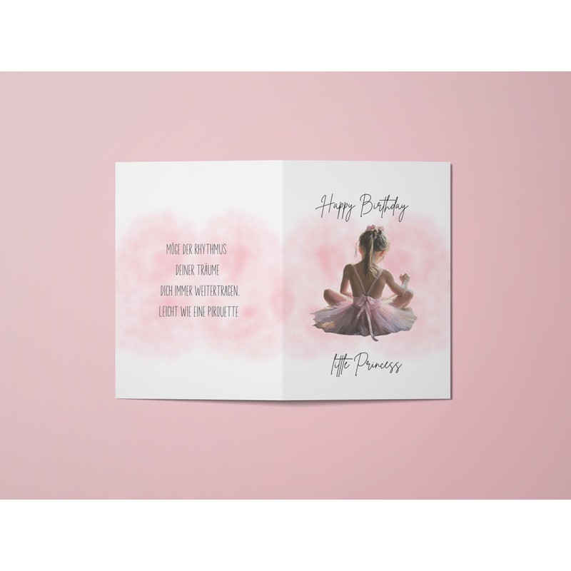 - Enchanting and loving design: the card features a cute little girl in pink dress sitting cross-legged with her back to the viewer. Her blonde hair is tied into a braid and decorated with a bow - a loving symbol of childhood, joy and security.