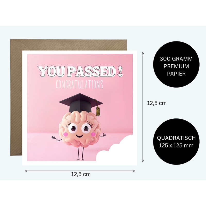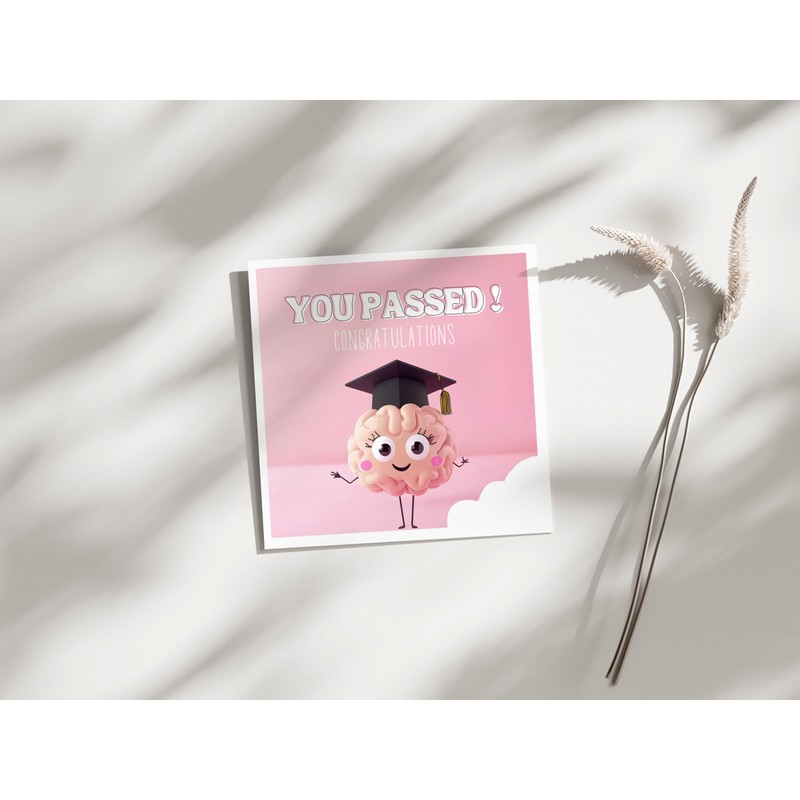 - FUN & MOTIVATIONAL DESIGN The card features a cute brain with big googly eyes, long eyelashes, pink cheeks and a graduation hat. The cheerful look and motivational message "You Passed!" With a small heart as an exclamation mark they make the perfect card for any successful graduation.