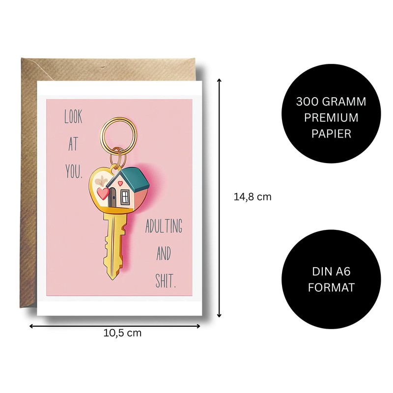WBdesignz Funny Greeting Card - Adulting and - New Home Card - Humorous Housewarming Card with Key Design - Friends & Family - Includes Envelope