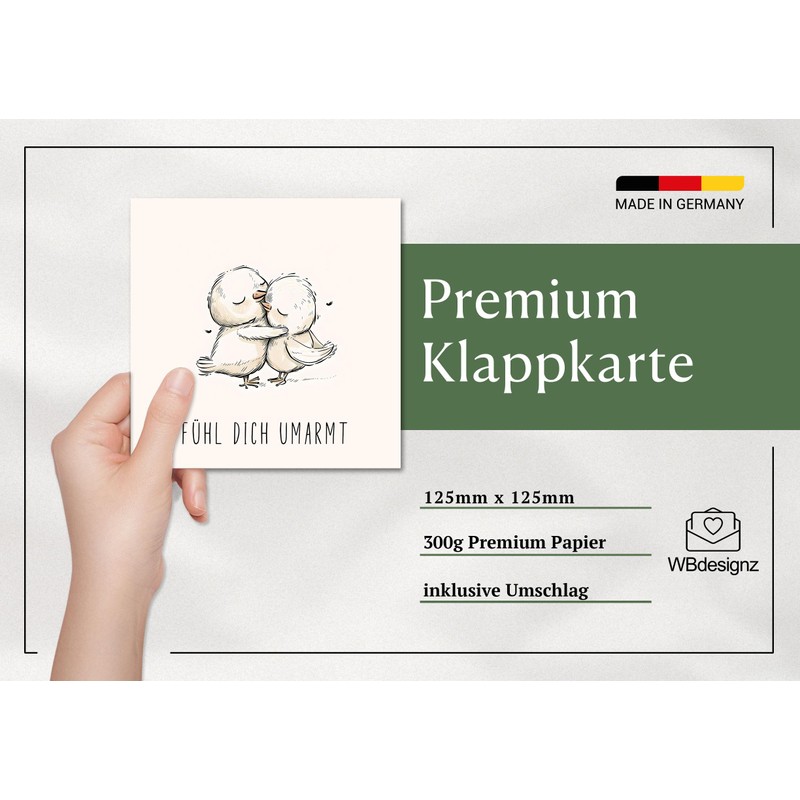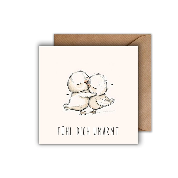Send warm farewell greetings with our lovingly designed farewell card that conveys warmth and care in a sweet, pictorial expression. This card in the format 125 mm x 125 mm shows two cute birds that find themselves together in a stirring hug under the matching saying "Fühl dich umarmt". This representation is not only delightful, but also symbolises security and closeness, perfect for conveying loving farewell words. The high-quality print on 300gsm premium paper ensures that both the delicate colours of the birds and the emotions they convey are clear and vivid. The quality of the paper promises not only a pleasant feel, but also a long service life, making the card a beautiful memory for the recipient. The card is complemented by a matching kraft paper envelope that underlines ecological responsibility and wraps the card safely and stylishly. This envelope completes the overall look and makes the card ready to ship whether it is presented in person or sent by post. The farewell card is great for colleagues, friends or family members who may take on a new professional challenge, move to another city or go on a longer trip. It is ideal for the last working day, as a loving addition to a farewell gift or simply as a special gesture to give the farewell a personal and warm frame. Whether it's a farewell to a valued co-worker, saying goodbye to a good friend, or as a comfort for family members moving away, this card conveys your feelings in a way that is both touched and remembered. "Feel embraced" is more than just a saying; it is a message that provides comfort and strengthens connectedness, even when words are difficult. With this card you are not just sending a greeting, but a warm, hugging gesture that makes leaving a little easier.