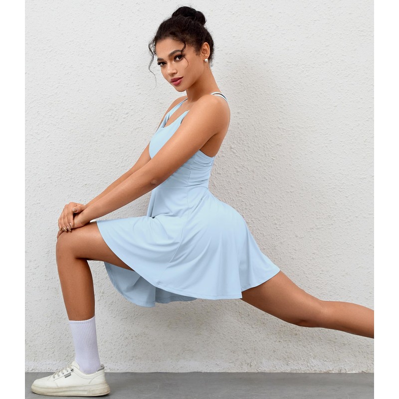 - FEATURES: Women's sports dress with bra built-in features fashion forward and beyond designs, the athletic dress is made of open back double cross straps, sexy U-neckline, slim fit upper body, an A-line shape, length to thigh, loose dress hem gives you more space during moving.