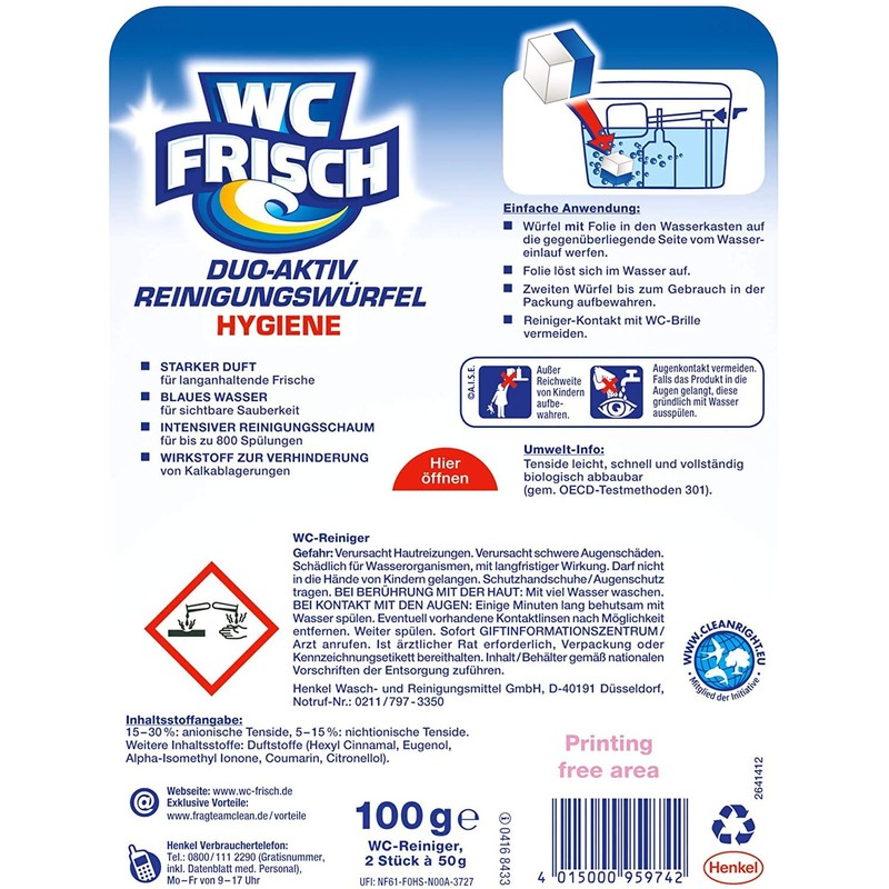 - WC Frisch Duo-Aktiv cleaning cubes offer you hygienic freshness and cleanliness for up to 800 flushes