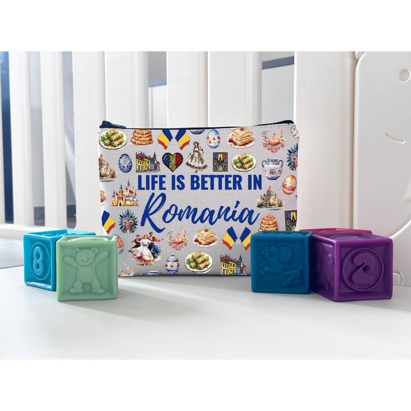 WCGXKO Romania Souvenir Makeup Bag Romania Travel Gift Romania Vacation Gift Life Is Better in Romania (Romania Bag)