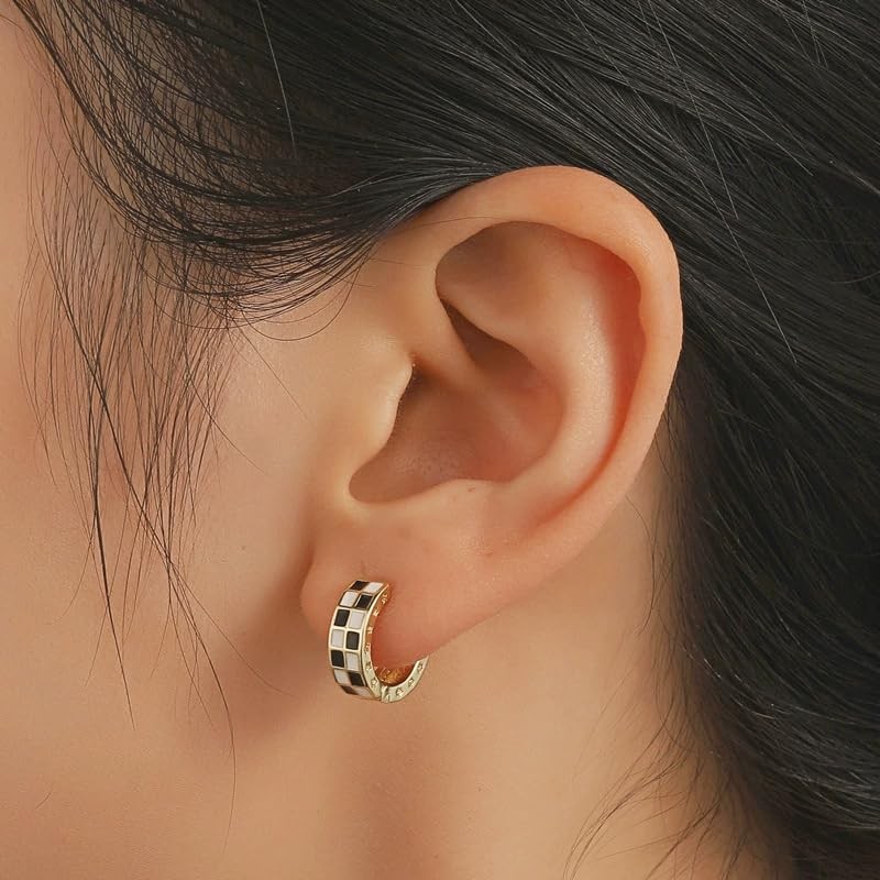 - CLASSIC DESIGN: Dainty round huggie hoop earrings featuring a chic checker flag pattern perfect for everyday wear