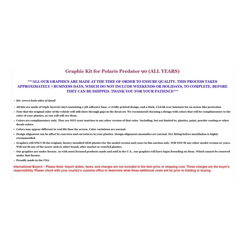 ***ALL OUR GRAPHICS ARE MADE AT THE TIME OF ORDER TO ENSURE QUALITY. THIS PROCESS TAKES APPROXIMATELY 7 BUSINESS DAYS, WHICH DO NOT INCLUDE WEEKENDS OR HOLIDAYS, TO COMPLETE, BEFORE THEY CAN BE SHIPPED. THANK YOU FOR YOUR PATIENCE***