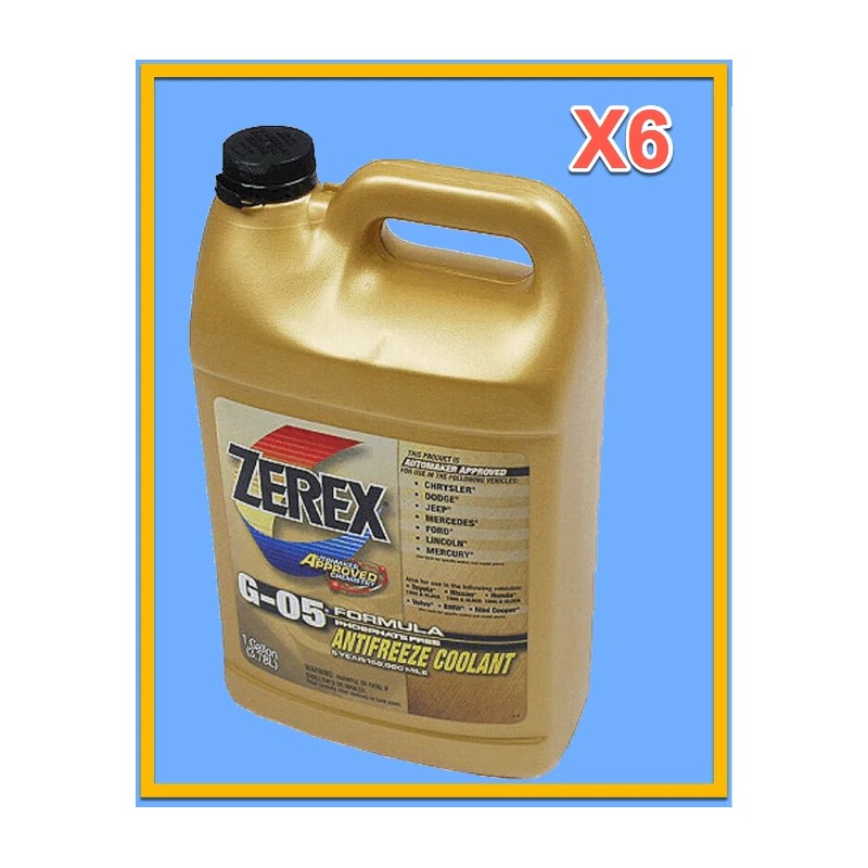 ZEREX G-05 is the automaker approved original chemistry used in newer Ford, Chrysler and Mercedes-Benz automotive and diesel engines. Its Hybrid Organic Acid Technology (HOAT) chemistry combines the best of conventional and organic acid-based chemistry to provide the ultimate protection against rust and corrosion. ZEREX G-05 antifreeze/coolant uses the highest quality virgin ethylene glycol for freeze and boilover protection and a hybrid organic acid corrosion inhibitor package to protect your engines from liner pitting and corrosion.Features & Benefits: