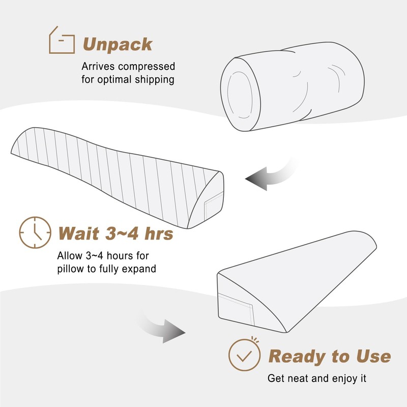 - Compressed package: It will be received in a compressed state to save cost for my customers. Compressed in a clear vinyl bag separately into a white stiff paper carton which can protect the product well and it is good choice for a gift sent directly to your family or friends. After opening the package, let the wedge pillow stay for 3-4 hours to expand completely to its original shape before use.
