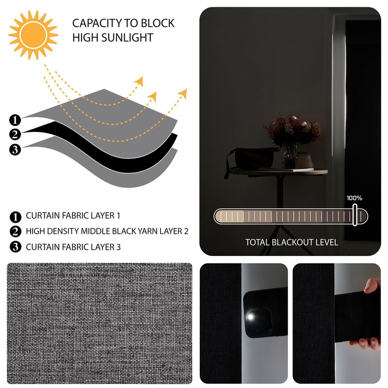 - New technical fabric: 100%Block lights, it is triple layers(front and back layers are the same textured and mixed blend yarns) looks elegant and luxury seeing through from inside or outside good choice for home aesthetics. And the black inter layers can absorb and insulate heat and lights efficiently. Wrinkle-free, stiff and thick The product packaging wrinkles can be easily smoothed out by simply laying it flat and repeatedly pressing down on the folds.