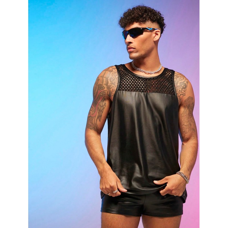 - Features: contrast mesh, round neck, sleeveless, pu leather