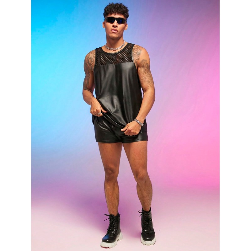 WDIRARA Men's 2 Piece Outfit Mesh Sheer Pu Leather Tank Top and Track Shorts Set, Black, Medium