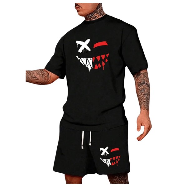WDIRARA Men's 2 Piece Short Sets Graphic Print Short Sleeve T Shirts and Drawstring Shorts Clothing Set Black 3X-Large