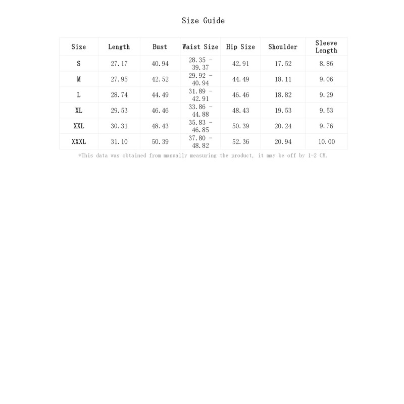 XL:Bust:46.5IN,Length:29.5IN,Shoulder:19.5IN,Sleeve Length:9.5IN,Hip Size:48.4IN,Waist Size:33.9-44.9IN