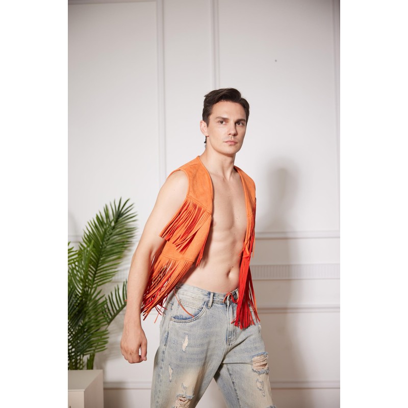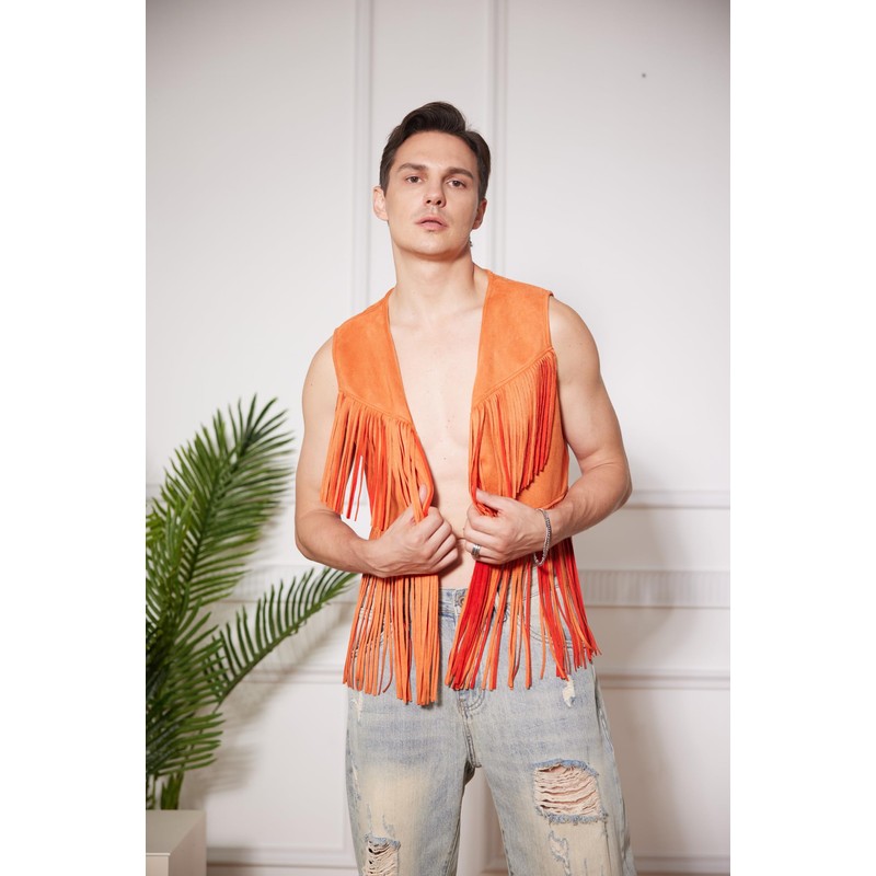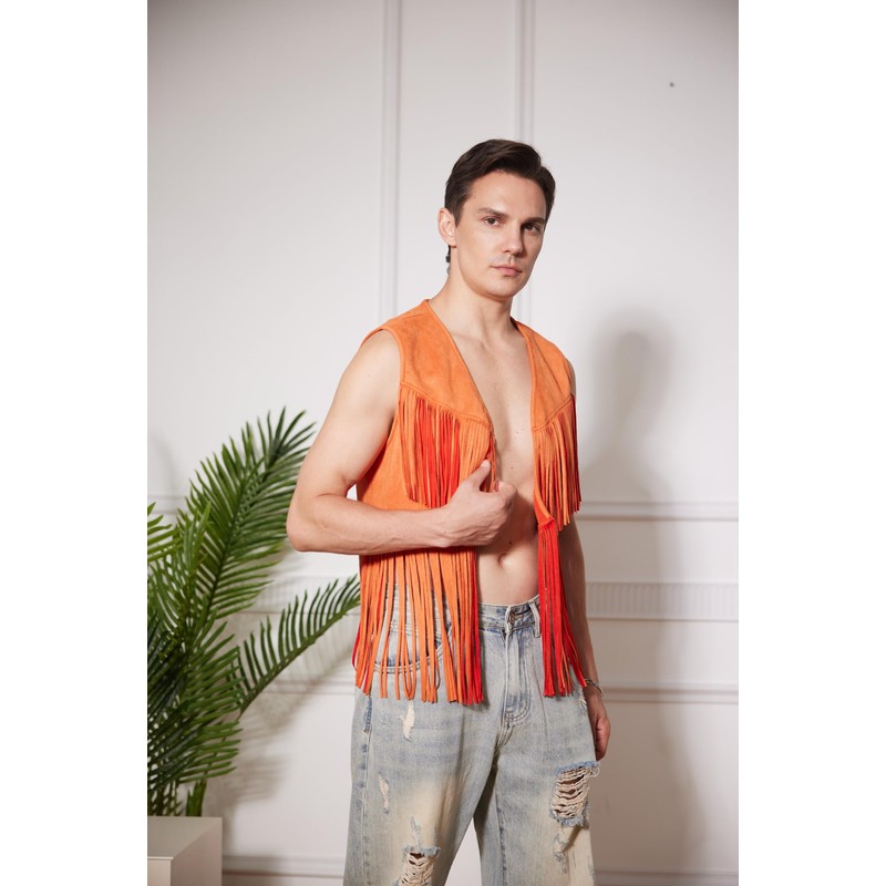 WDIRARA Men's Open Front Sleeveless Fringe Hem Party Club Jacket Vest Outerwear Orange Solid S