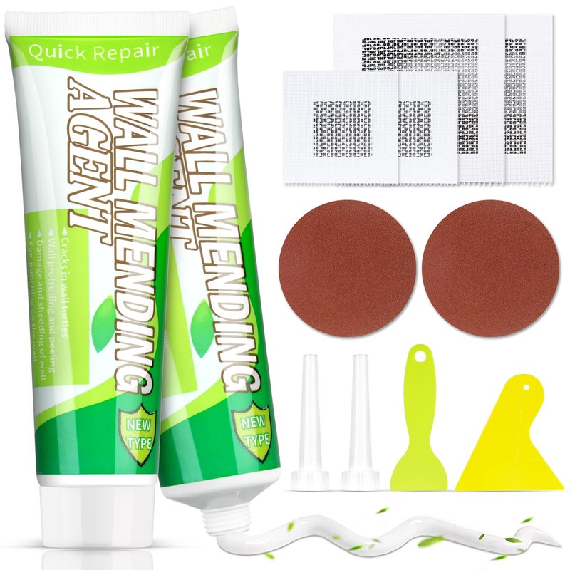 - Our wall mending agent kit has 2 * 100g wall repair paste, 2 * scraper, 2 * nozzle extenders, 2 * 4 inch sandpaper, 2 * 2 inch wall repair patch, 2 * 4 inch wall repair patch.