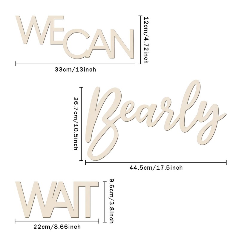 - Appropriate Size: The size of 'We Can' is 9.5 x 5.5 inches / 24 x 14 cm, the size of 'Bearly' is 6 x 3.8 inches/ 15.2 x 9.6 cm, the size of "Wait" is 7.99 x 6 inches/ 20.3 x 15.2 cm. And all the letters are laser cut out from high quality 1/5" thick maple plywood. Thick enough for decoration