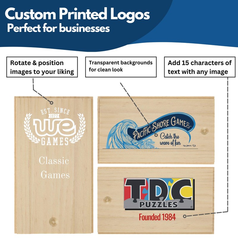 WE Games Custom Color Logo or Image Double 6 White Dominoes Set in Wooden Case