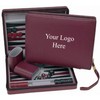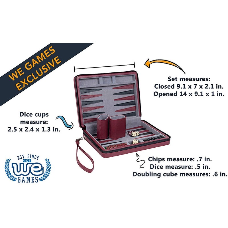 - HIGH QUALITY: Burgundy leatherette travel backgammon set with a zipper closure and a removable carrying strap. The sturdy and intricate construction of this set is what sets it apart from others. Closed it measures 9.125 x 7 x 2.134 in. While open it measures 14 x 9.125 x 1.026 in. The set includes 30 magnetic backgammon chips in two different colors with felt bottoms, 2 felt lined dice cups, 4 dice in two different colors, and 1 doubling cube.