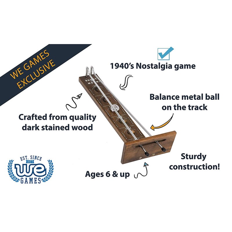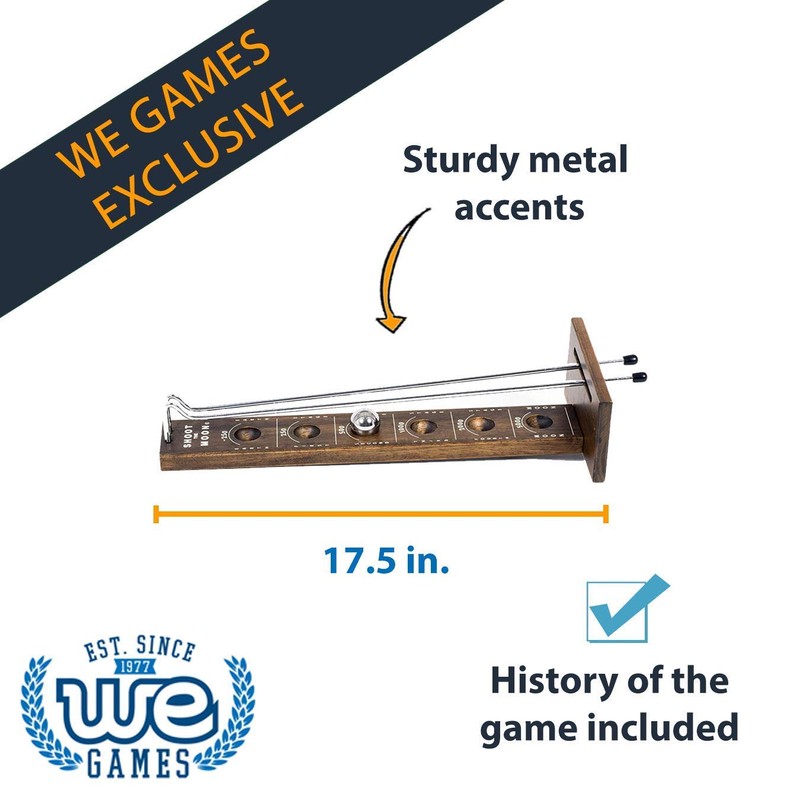 - SHOOT THE MOON: Crafted from quality wood in a dark stain for a refined aesthetic. The board itself measures 17.5 x 7 x 3.75 inches. With beautiful engraving and sturdy metal rods and balls this set is truly a cut above the rest.