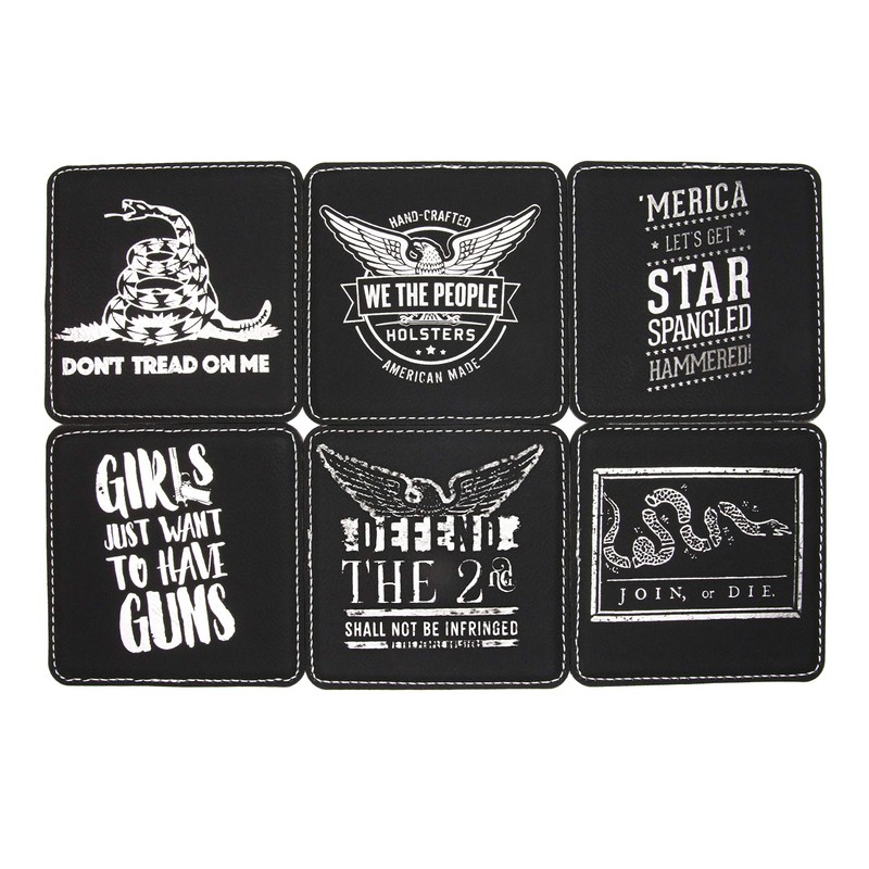 Show off your patriotic spirit and protect your tabletops at the same time! These funny political coasters make thoughtful and functional republican gifts and will look great on any coffee table, desk or dinner table. Crafted from genuine Leather with white stitching, our MERCA Coaster set features 6 patriotic coaster designs from We The People Holsters.