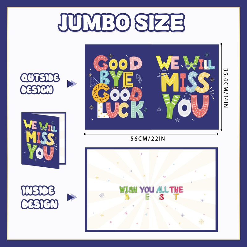 - Oversized and Foldable: The farewell card is designed with a unique and eye-catching "Jumbo" size, measuring 14x22inches when unfolded, and the folded size of it is about 11 x 14 inches, providing plenty of room for guests to write their names and personal messages. It's the perfect decoration for any going away party