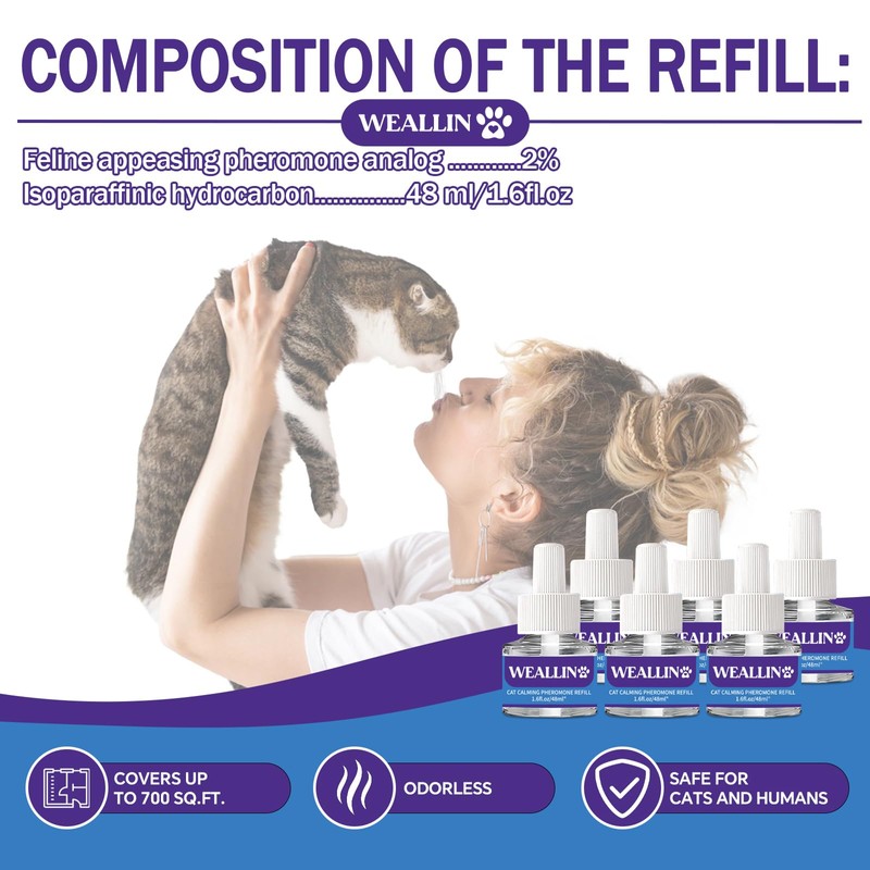 - Long-lasting Calm: The value refills kit includes 6 refills and each 48ml cat pheromone diffuser refill can ensure a continuous calming effect for up to 30 days then total can last for up to 180 days, offering extended relief from anxiety and promote overall well-being for your cat.