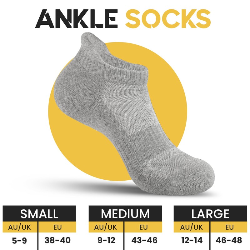 - Versatile Design & Sizes: Enjoy comfort and style with our set of 06 pairs of ankle socks suitable for both men and women, providing a perfect fit for all. Specifically designed to fit three different AU sizes small 5-9 (38-42), Medium 9-12 (43-46) and Large 12-14 (46-48). These no show socks men offer a perfect balance of softness and flexibility.
