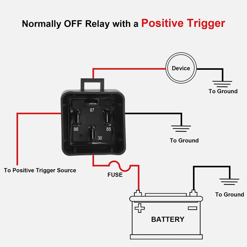 - Wire Specifications: Black 16AWG - Ground (85), Red 14AWG - VDC (30), White 16AWG - Trigger (86) and Blue 14AWG - Output N/O (87)