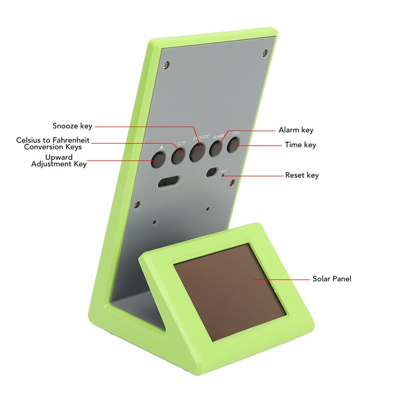 1、MULTIPLE APPLICATION SCENARIOS: The solar clock is suitable for home, office, school, hotel, laboratory, kindergarten, kitchen, garden, greenhouse, basement, baby room and many other places. 2、TIMING TEMPERATURE AND HUMIDITY FUNCTION: The solar clock has a timer function, which can set the time on demand and provide convenient timekeeping. It also has the function of measuring temperature and humidity, which can monitor the temperature and humidity readings of the environment in real time. Especially suitable for greenhouses, offices and other places where environmental conditions need to be controlled. 3、EASY TO USE AND READ: The solar clock has a clear LCD display that is easy to use and read. Large numbers provide better visibility and clear readings, making it easy for users to get the information they need. 4、DURABLE: The solar clock is made of ABS material, which is durable and can be used for a long time without being easily damaged. It can maintain reliability in daily use. 5、SENSOR AND SWITCHING FUNCTION: The solar clock is equipped with a temperature and humidity sensor, which can automatically sense the humidity and temperature of the air within the measurement range and automatically display the temperature and humidity values on the display. Meanwhile, it also supports the arbitrary switching of °C °F to meet the needs of different users' temperature units.