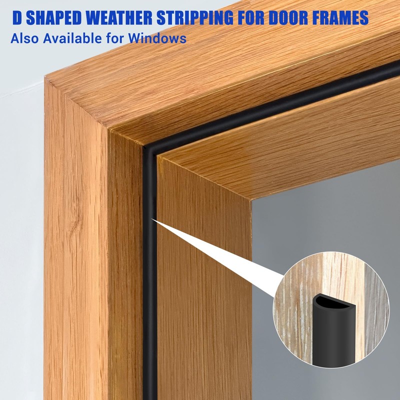 Weather Stripping Door Seal Self Adhesive Door Weather Strip Silicone D Shaped Door Seal Strip for Door Frame/Window Seal, 20Ft, Black (3/8" W × 1/4" T)