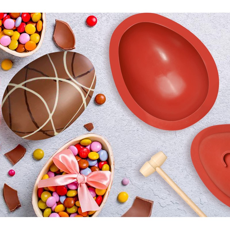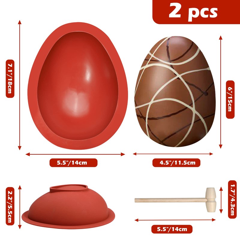 - BREAKABLE CHOCOLATE EGG SET - You will get 2 pcs of Easter egg chocolate molds and 1 piece of wooden hammer. Mold size is 7.1 x 5.5 x 2.2 inches. The dimension of the finished easter egg is 6 inch tall, 4.5 inch width. Perfect size for you to fill these beautiful, edible hollow chocolate eggs with candies, toys, love notes, or anything else you want!