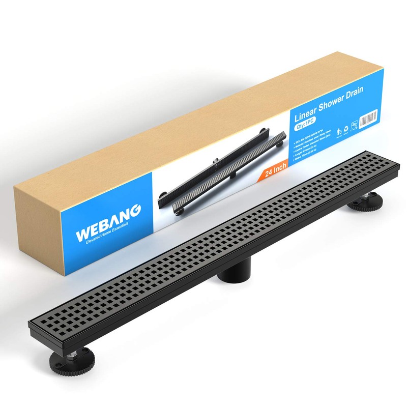 WEBANG 24 Inch Shower Linear Black Drain Rectangular Floor Drain with Accessories Square Hole Pattern Cover Grate Removable SUS304 Stainless Steel CUPC Certified Matte Black