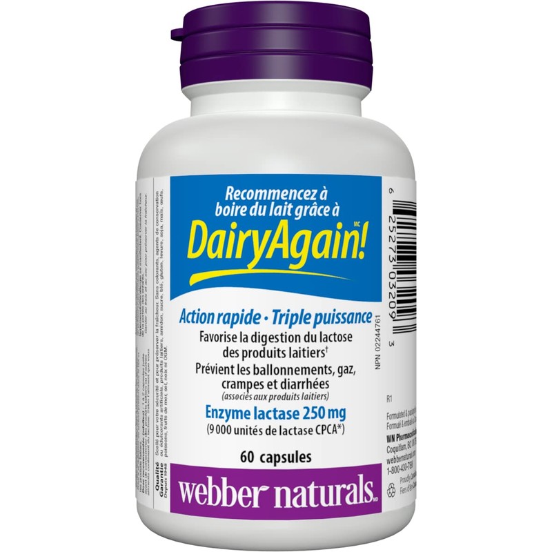 Webber Naturals Dairy Again Lactase Enzyme 250 mg, 60 Capsules, Helps Digestion of Lactose in Milk and Dairy Products