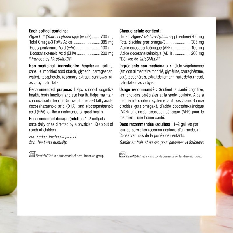 • Each Softgel Contains: 700 mg Algae Oil, providing 385 mg of Omega-3 Fatty Acids (100 mg EPA and 200 mg DHA)