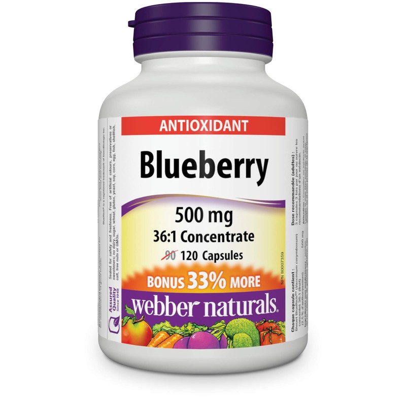 Blueberry 36:1 Concentrate from Webber Naturals contains BlueRich, a blueberry concentrate shown to be effective in fighting the free radicals that accelerate disease and aging. Blueberries are potent antioxidants for the maintenance of good health. Each capsule contains a 36:1 concentrate, the equivalent of 36 g of blueberries into one gram of concentrate.