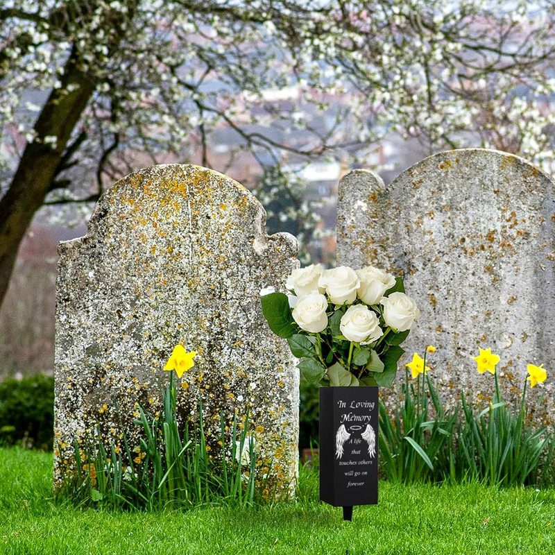 - Cemetery Flowers Vases:This stately black cemetery vase is adorned with angel wings and a halo with the touching inscription "In Loving Memory: A life that touches others will go on forever", conveying eternal thoughts and respect