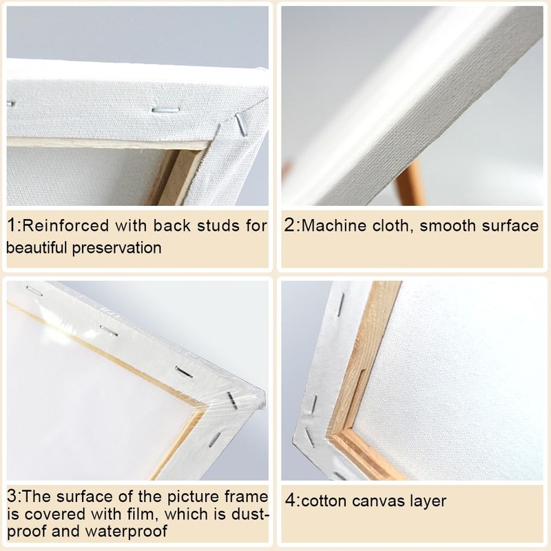 - Pre-stretched 8x10 canvas: The canvases are tight and easy to handle,with strong colouring power and a nice touch for easier colouring.Each canvas is stretched and back-pinned to a wooden frame which is stable and strong and resistant to warping