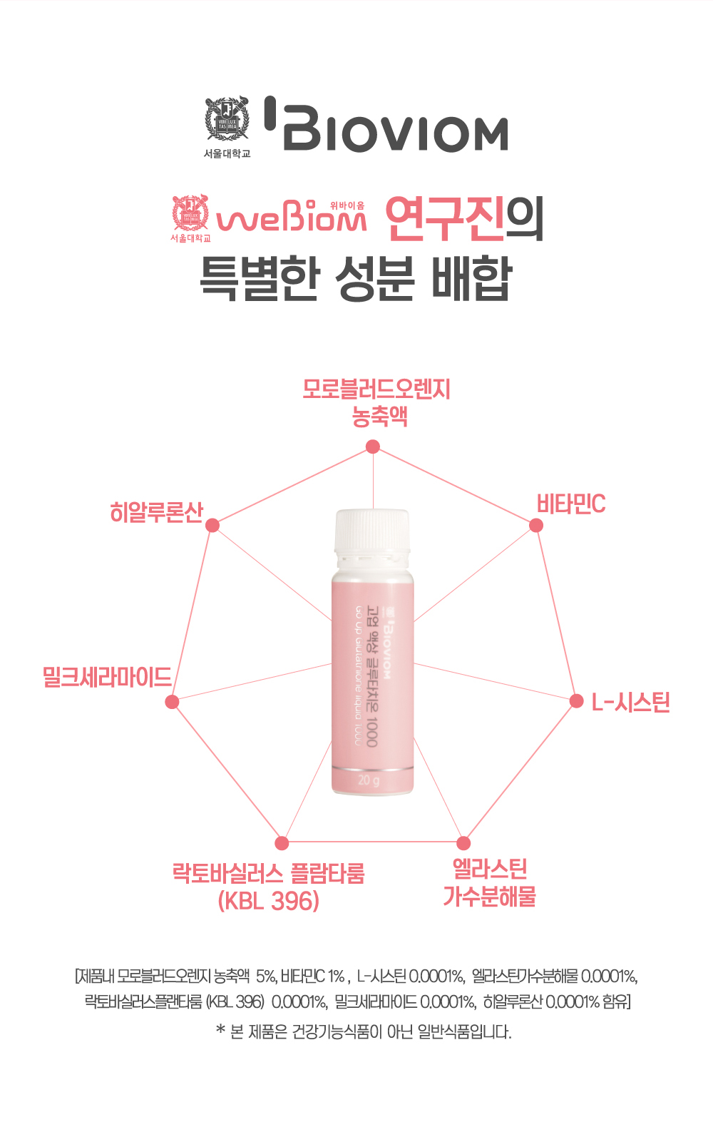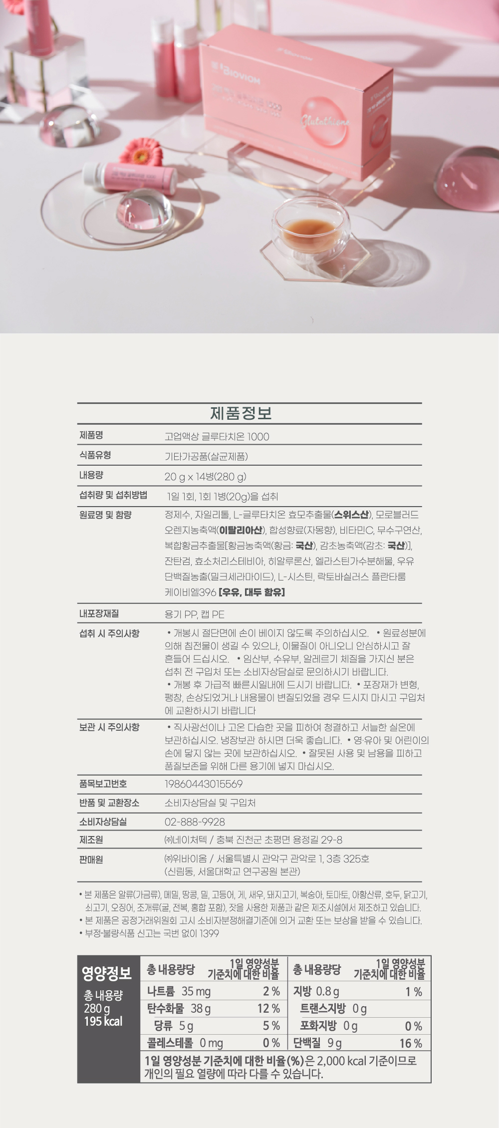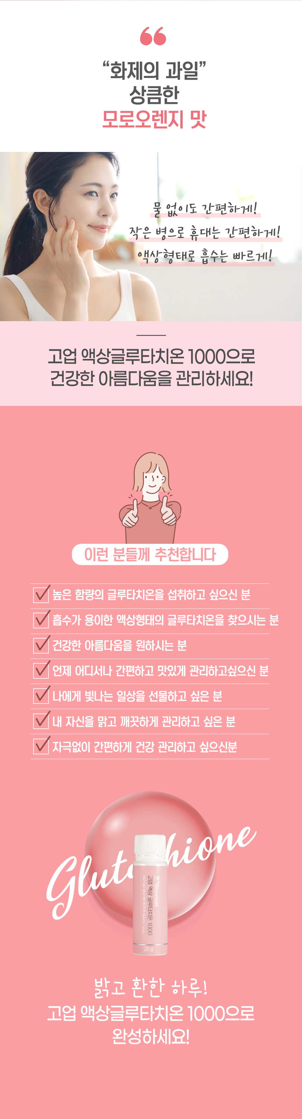 - Main Ingredients/Contents (Origin of Raw Materials): Purified water, xylitol, L-glutathione yeast extract (made in Switzerland), Moro blood orange concentrate (made in Italy), synthetic flavoring (grapefruit flavor), Vitamin C, anhydrous citric acid, complex golden extract [golden concentrate (golden: made in Korea), licorice concentrate (licorice: made in Korea)], xanthan gum, enzyme-treated stevia, hyaluronic acid, hydrolyzed elastin, milk protein concentrate (milk ceramide), Lactobacillus plantarum KBL396 [contains milk and soy]