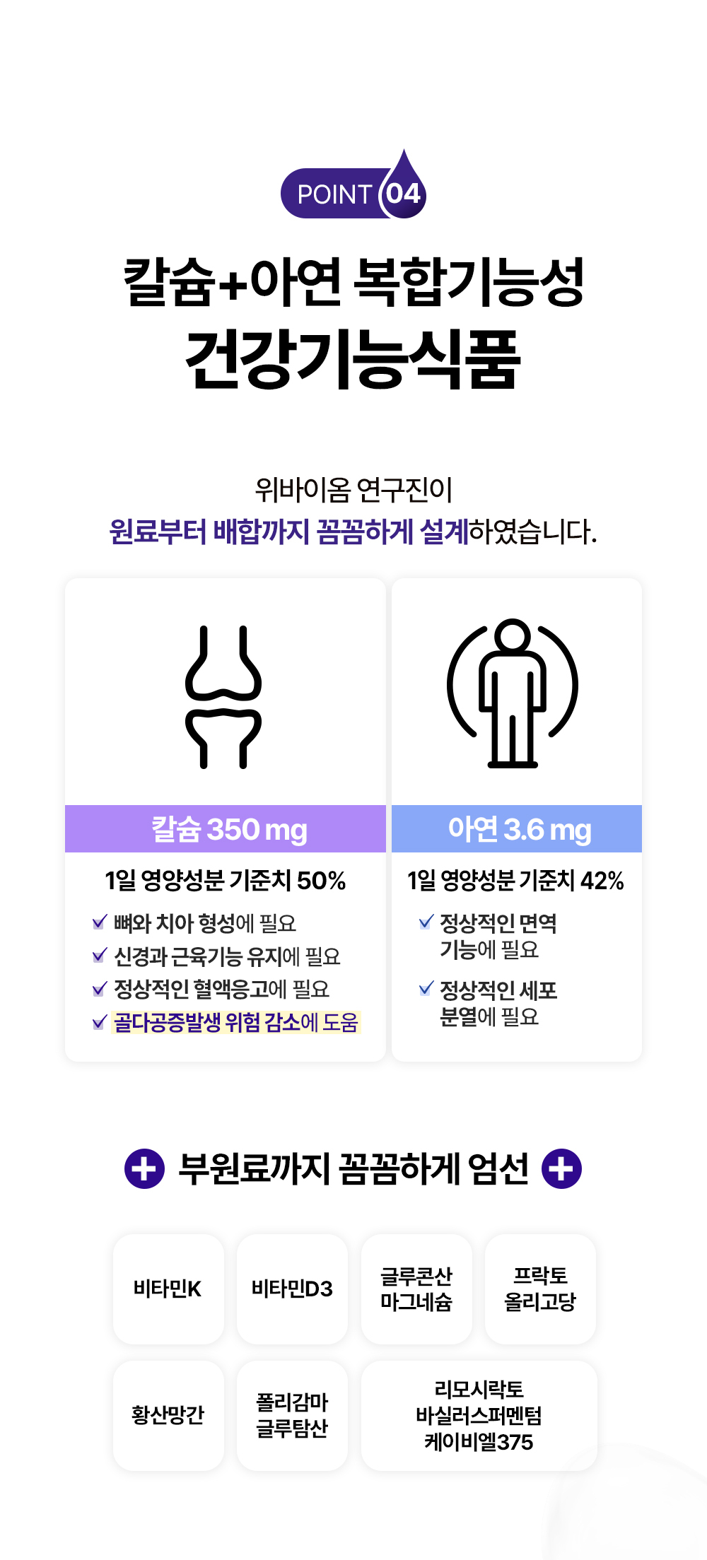 | Nutritional Information | 350mg Calcium, 3.6mg Zinc per daily intake. |