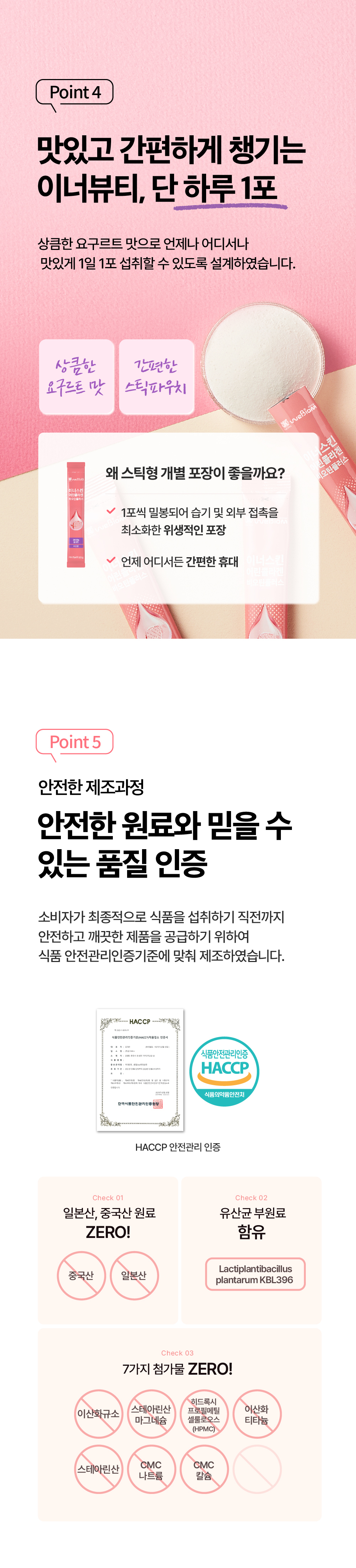 - main ingredients/contents (origin of ingredients): Fish collagen peptides (from India/collagen peptides, citric acid), biotin mixture (biotin, microcrystalline cellulose), vitamin D3 mixture [vitamin D3, arabic gum, sugar, corn starch, glycerin fatty acid ester, silicon dioxide, DL-alpha-tocopherol], glucose, yogurt mixed powder {concentrated fermented milk [mixed skimmed milk powder {foreign: USA, Netherlands, Australia}], vegetable cream [palm oil (from Malaysia)], other sugar}, yogurt flavor powder (dextrin, synthetic flavor, arabic gum, propylene glycol, lemon oil, triacetin, ethanol, purified water), tricalcium phosphate, enzyme-treated stevia, mixed probiotics powder, aloe vera gel powder (from the USA), elastin peptide, oat dietary fiber, Lactobacillus plantarum powder, Lactobacillus plantarum (KBL396), L-glutathione yeast extract, vitamin C, vegetable mixed powder, contains milk, soybeans, tomatoes
