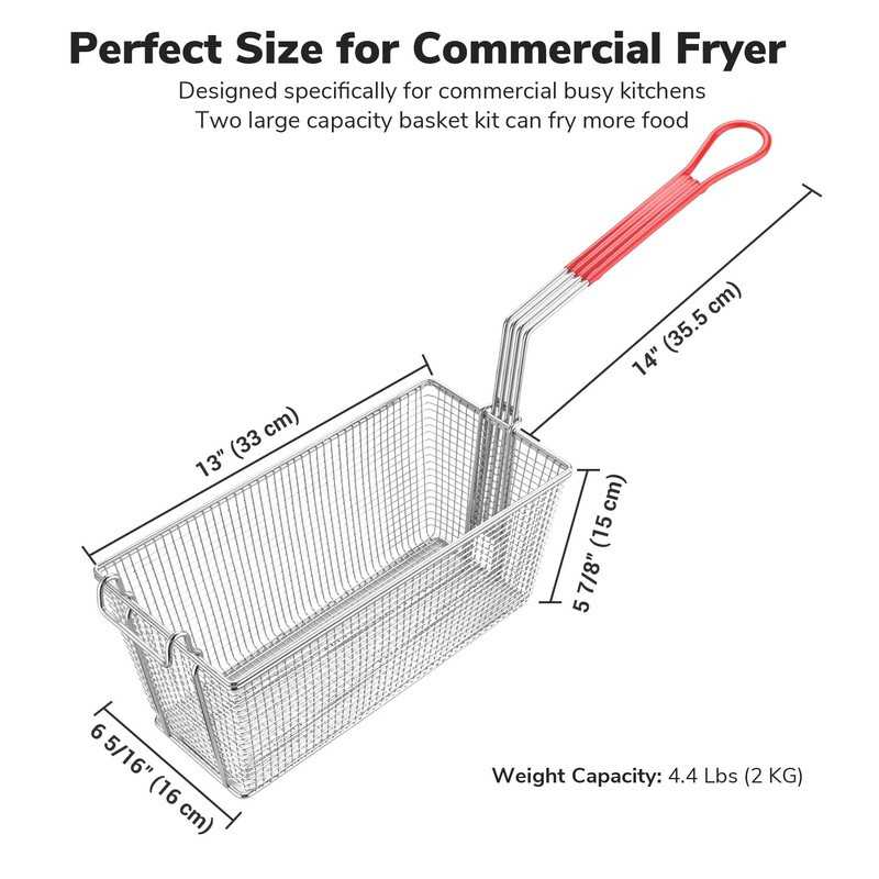 - Large Capacity - This Set of 2 pcs Deep Fryer Baskets, featuring a large size of 13" x 6 5/16" x 5 7/8" for holding 4.4 Lbs French fries, is perfect for storing all your foods in one place, helping you to avoid repetitive fishing around or over-frying of individual food, ideal for both commercial and home use