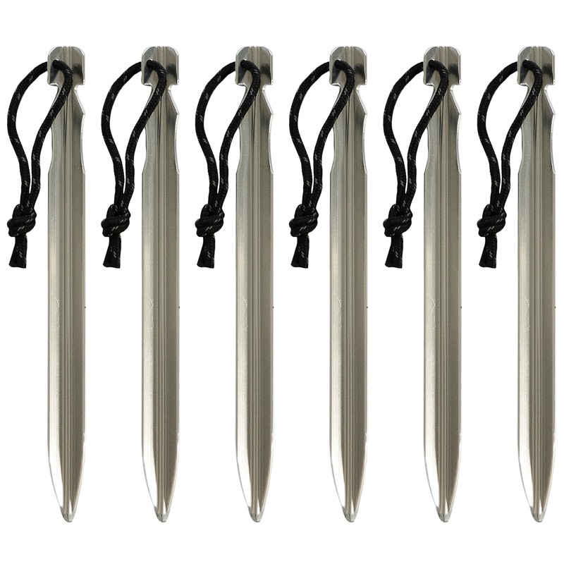 6 pegs made of DUR aluminium, suitable for soft to medium hard floors. The cord gives good access when pulling out the peg.
