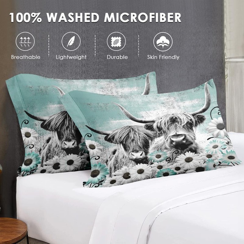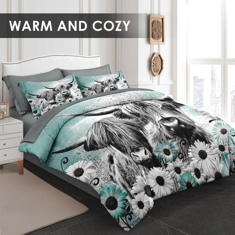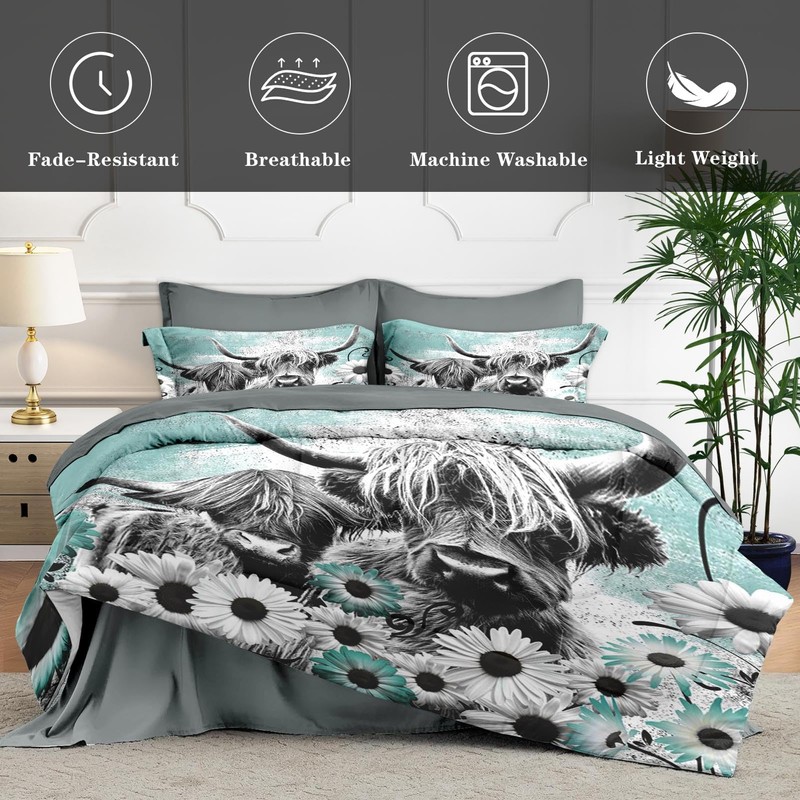 WeCozy 7 Pcs Queen Size Comforter Set with 2 Pillowcases & 2 Shams, Highland Cow Animal Bedding for Kids and Adults, Buffalo Bull Farm Daisy Bed in a Bag with Flat Fitted Sheet