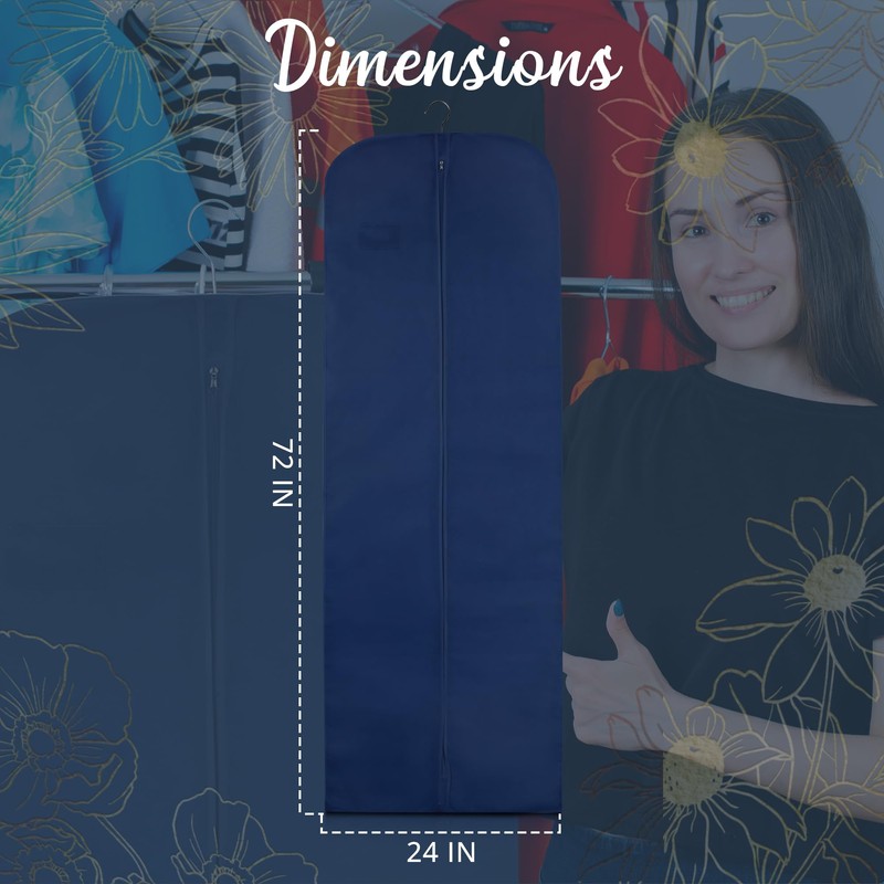 - VERSATILE SIZING, EASY MAINTENANCE: With approximate dimensions of 24” (W) x 72”(L) inches, our wedding dress bag is the ideal length to perfectly fit dress, suits, shirts, jackets, children's clothes, and more. Plus, our travel garment bags are easy to clean – simply wipe them with a damp cloth for a quick refresh.