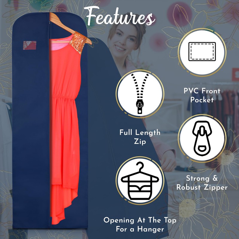 - SMART STORAGE SOLUTIONS: Featuring a clear PVC front pocket, full-length zip, top hanger opening, and a foldable design with a bottom loop, the long dress bag makes storing and transporting your attire a breeze. Maintain a clutter-free and organised closet, no matter where you go.
