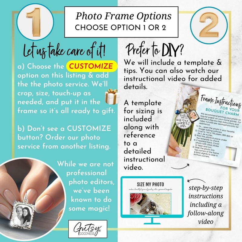 - THE PROCESS: No supplies (like glue), or crafting skills (or luck), are needed with our bridal memorial charms. Just slip your photos inside the picture frame photo charms & tuck the corners. With a customized listing you can choose additional accessories: a something-blue angel, typewriter charms, extra frames, etc. so you can be confident it will picture-perfect for the bride.