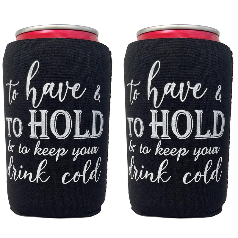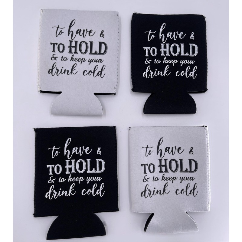 - Each wedding cooler is printed with text: to have and to hold and to keep your drink cold.