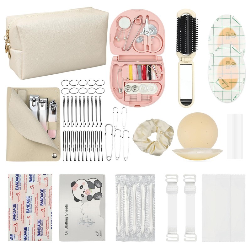 MakeUp Bag(White) x 1, Manicure Set x 1, Sewing Kit x 1, Clear Bra Straps x 2, Nipple Covers x 2