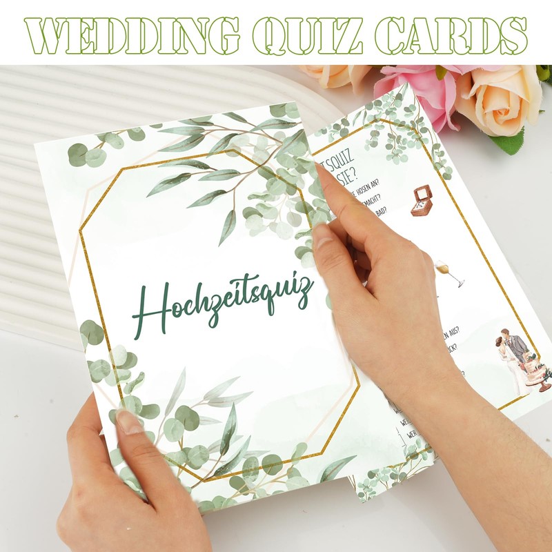 - 50 wedding quiz cards: The wedding game set contains 50 wedding quiz cards, so that 50 guests can participate in the game at the same time. With the dimensions 14.8 x 21 cm, the wedding games for the bride and groom bring joy to everyone at the wedding.