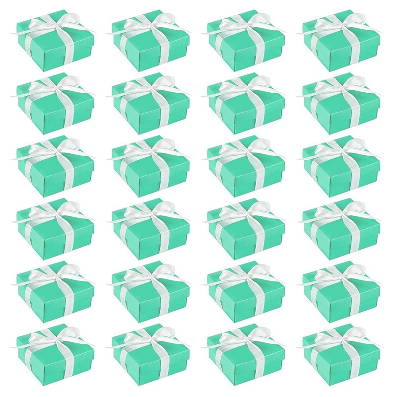 - CLASSIC LOOK: These beautiful turquoise gift boxes work well with small candies or other small gifts. This set comes with 24 gift boxes and satin ribbons for all your gift sending needs.