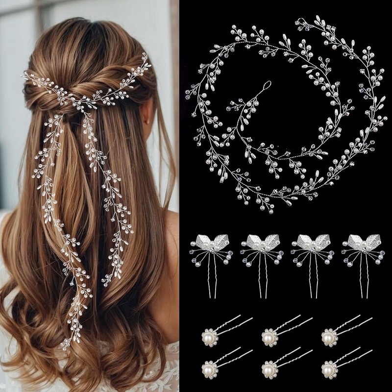 Includes 11 pieces: a 100cm wedding hair vine and 10 silver hairpins in two styles. Made of alloy, faux pearls, and crystals for a smooth, shiny, and durable finish. Adjustable design with delicate leaves, pearls, and rhinestones. Perfect for weddings, parties, photography, and gifts.